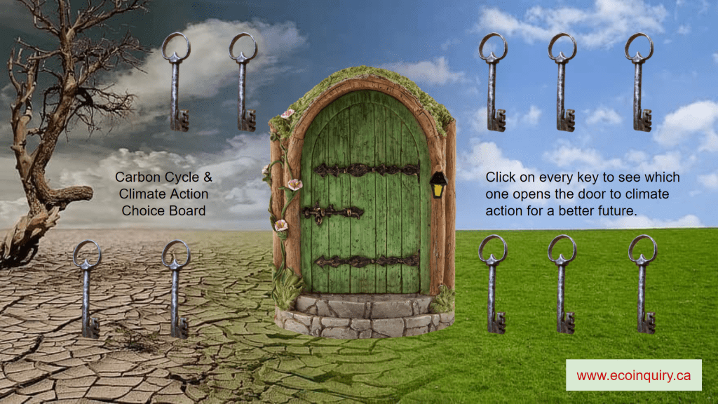 In the Carbon Cycle Eco-Game, students are introduced to the major carbon sinks on the planet, and the greenhouse effect increasing global warming from human activity caused by releasing greenhouse gases into the atmosphere via the combustion of fossil fuels. On the virtual choice board below, students can click on the keys to unlock strategies for taking climate action.